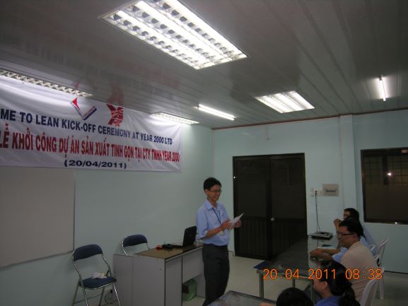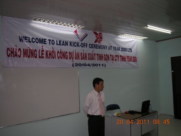 Buổi lễ khởi công diễn ra trang trọng với sự tham gia của Tổng Giám đốc Công ty TNHH Year 2000 người Hong Kong và Ông Nguyễn Quốc Minh, Chuyên gia Năng suất Chât lượng, CEO IMQ Corporation, Thầy Tôn Thất Lành, chuyên gia tư vấn Lean, Mr. Lâm, và toàn thể đội ngũ quản lý ở các Bộ phận và Chuyền sản xuất Công ty, tổng cộng gần 60 người. Với sự nghiêm túc của Ban Lãnh đạo Công ty nên không khí có vẻ hơi trầm lắng. Tuy nhiên ngay khi Tổng Giám đốc của Year 2000 bước lên tuyên bố việc áp dụng và tư vấn Lean sẽ diễn ra nhẹ nhàng từng bước và Lãnh đạo cao nhất luôn đồng hành, hỗ trợ, cũng như với kinh nghiệm của bên tư vấn Lean IMQ chắc chắc chương trình sẽ mang lại nhiều lợi ích cho toàn thể Công ty Year 2000. Sau lời chia sẻ, động viên và truyền cảm hứng này, không khí trở nên sôi động hẳn với sự đóng góp ý kiến và cam kết chân thành từ Mr. Nhơn, Quản lý Bộ phận Bảo trì và những người khác. Buổi lễ khởi công chương trình tư vấn Lean đã kết thúc thành công tốt đẹp với hình ảnh tất cả các thành viên Ban dự án thực hiện chương trình tư vấn Lean IMQ & Year 2000 bắt tay đồng lòng cam kết hết lòng thực hiện dự án Sản xuất tinh gọn Lean.